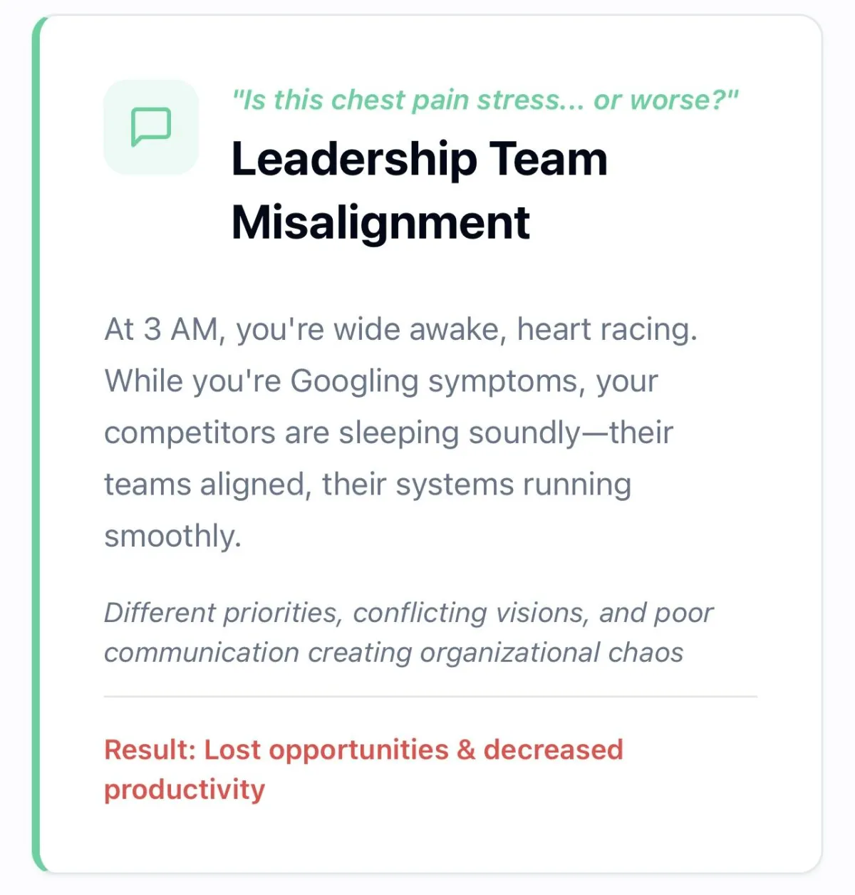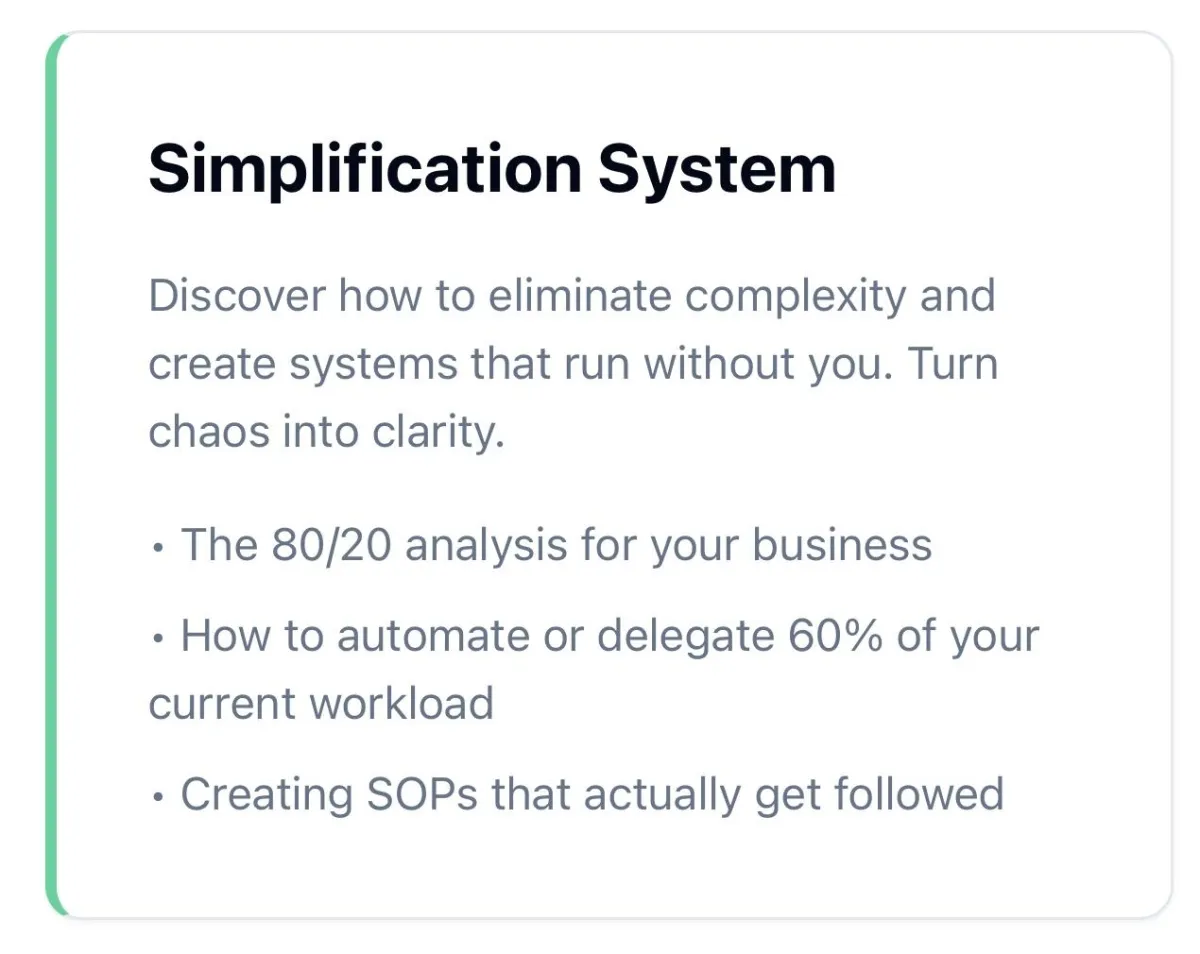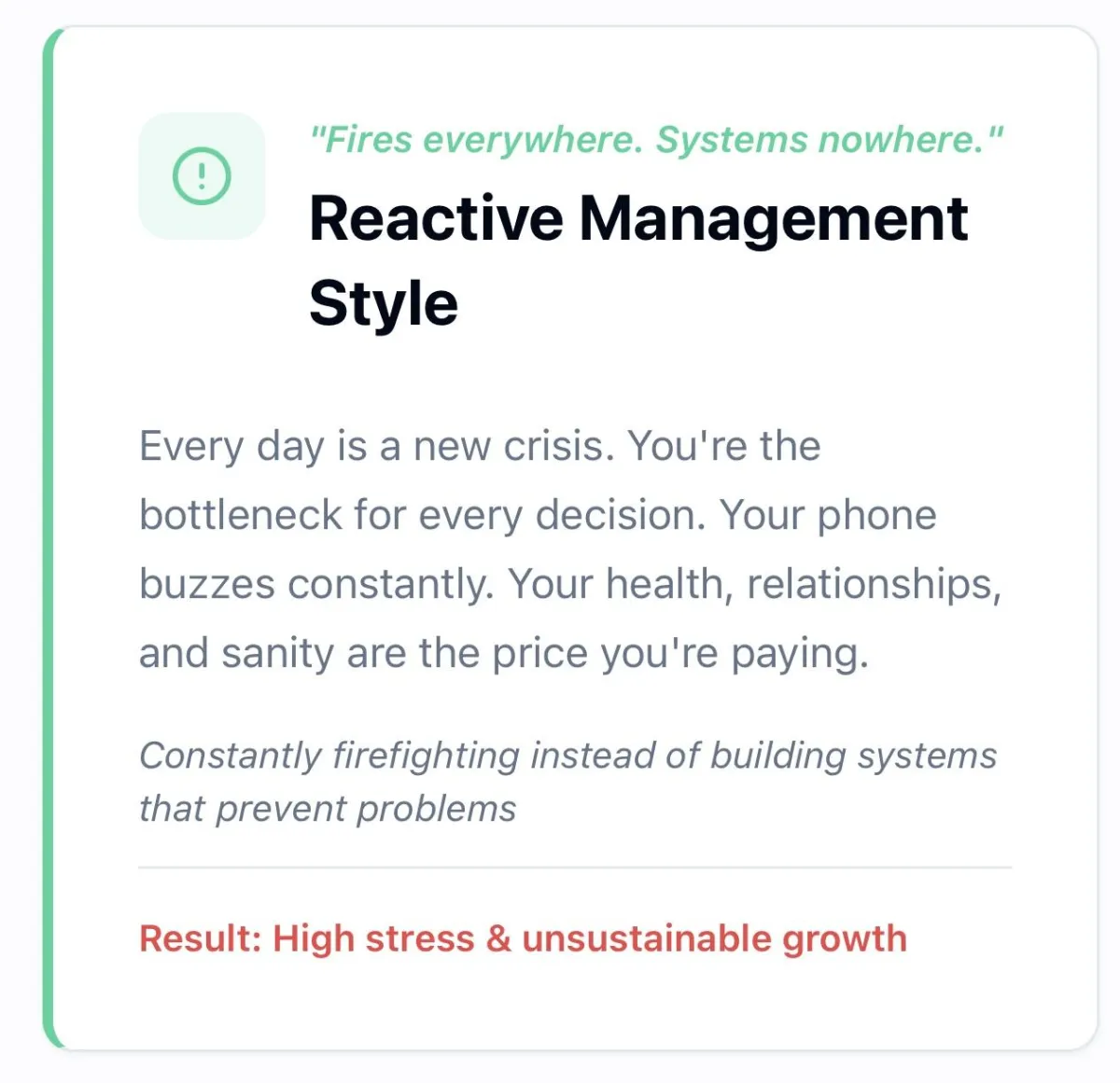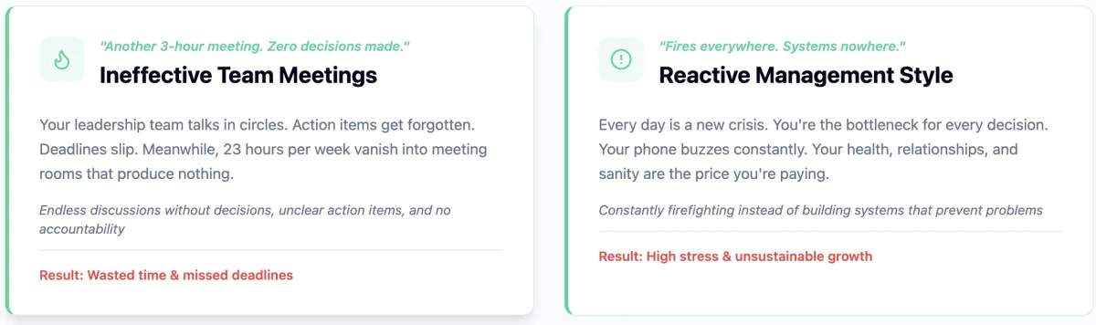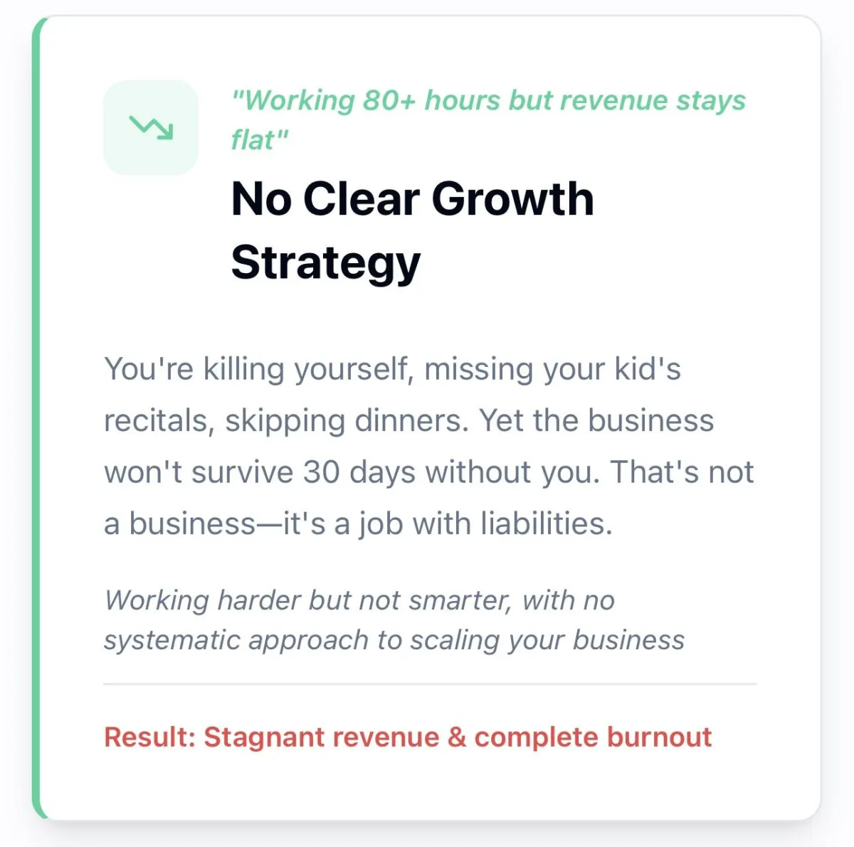 The workshop helps you identify what’s creating operational chaos and how to build a company that doesn’t rely on you daily.
