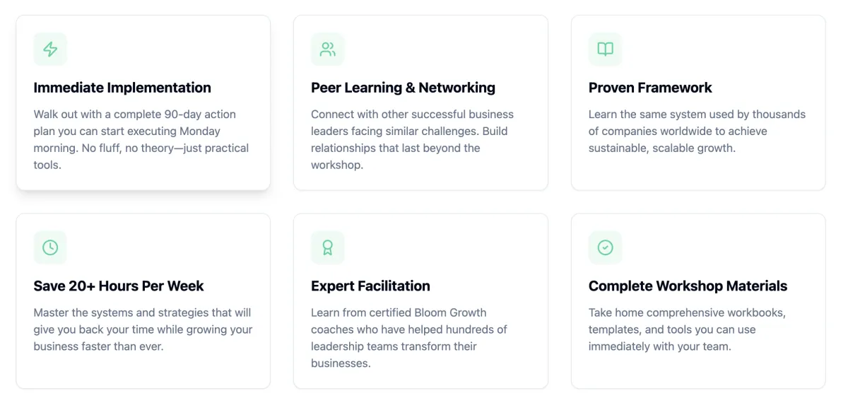 Unlike typical motivational or theory-based seminars, this is a structured, system-driven workshop backed by measurable frameworks such as the Bloom Growth OS and Eight Elements of Scale.
