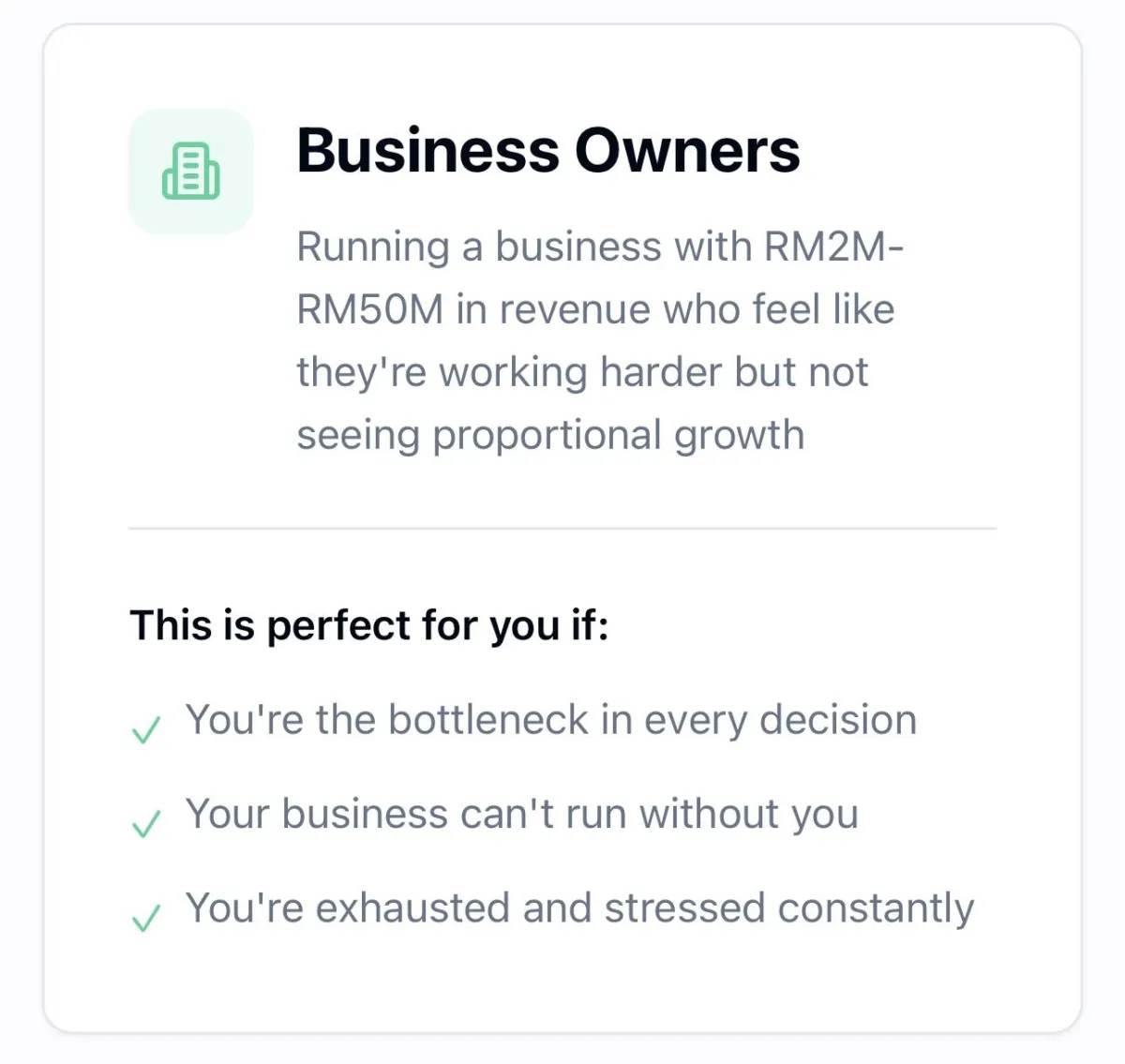 - Founders and CEOs leading teams with RM1–50 million in annual revenue.