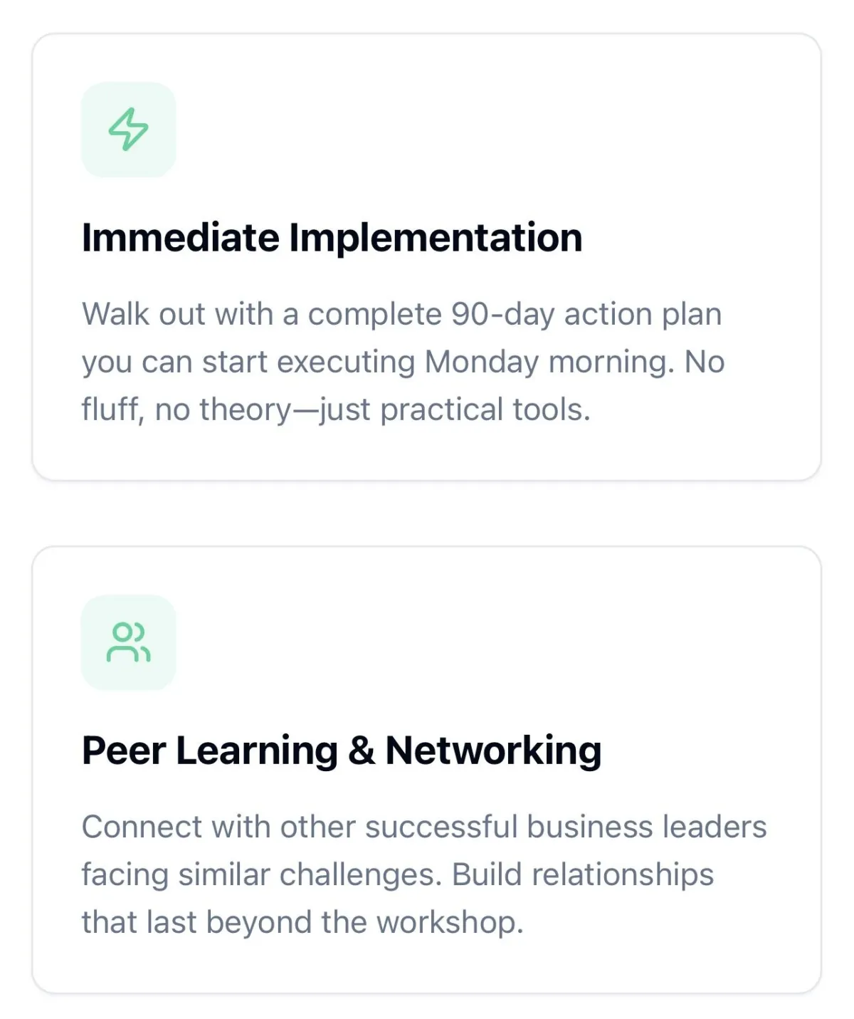 The one-day workshop includes full-day access, tools, and a 90-day post-event implementation roadmap for you and your team.